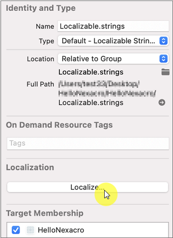 Xcode画面の右側にあるUtilitiesウィンドウで「Localize...」ボタンをクリックして、言語を選択します。事前にプロジェクト設定にて言語を追加していない場合には、デフォルトで英語が選択されます。