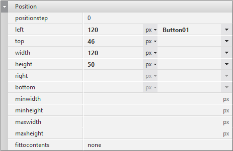 プロパティウィンドウからPosition関連のプロパティを設定する際に、設定値の単位をピクセル(px)もしくはパーセント(%)から1つのみ選択することができます。プロパティ値の単位を変更した場合、プロパティ値は単位に応じた値に自動的に変換されます。各プロパティ値は親コンポーネントを基準に設定されますが、PositionBaseを設定した場合には指定したコンポーネントを基準に設定されます。