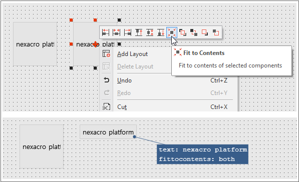 minwidth、minheight、maxwidth、maxheight、fittocontentsプロパティは、アプリケーションの実行時に反映されるプロパティです。nexacro studioのデザインモードで、プロパティ値に基づいてコンポーネントのサイズを変更するには、コンポーネントを選択して、メニューの[Design>Fit to Contents]もしくはツールバーやコンテキストメニューから[Fit to Contents]を選択します。