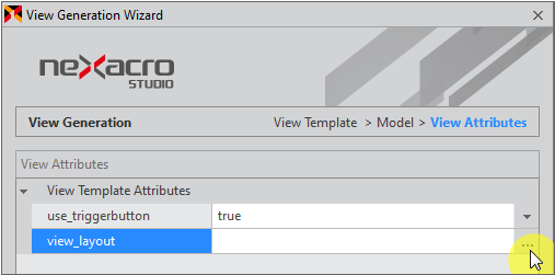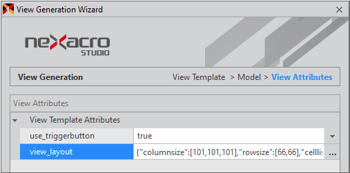 Viewテンプレートのfn_GetViewAttributeList関数内のedittypeが「Layout」である項目を設定した場合、View Generation WizardでView Attributes項目を設定する際にView Layout Editorを使用してレイアウト情報を設定することができます。