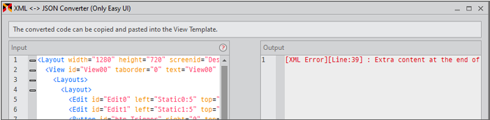直接入力したコードにエラーがあった場合には、変換ボタンのクリック時にOutputウィンドウにエラーメッセージが出力されます。