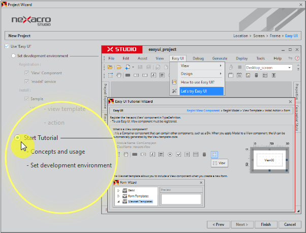 Easy UIの段階で[Use 'Easy UI' > Start Tutorial]項目を選択し、「Finish」ボタンをクリックすると、Easy UI Tutorial Wizardを実行します。