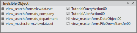 開発時に使用する画面に表示されないオブジェクトは、個別に管理することができる Invisible Objects領域が提供されます。該当ウィンドウは、ドッキングウィンドウ型で提供します。