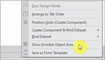 Invisible Objectウィンドウが表示されない場合、Design画面のコンテキストメニューを呼び出して [Show Invisible Object Area]を選択すると、Invisible Objectウィンドウを開くことができます。