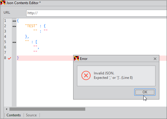 3 | 表示モード | Contentsタブを選択した場合、ツリービュー形式でデータを表示します。 Sourceタブを選択した場合、コード形式でデータを表示します。 |