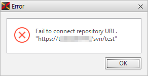 オプションにて、Project Repository、Generate Repository項目にリポジトリ情報とアカウント情報を通常に設定して保存する場合、リポジトリにアクセスして認証を処理します。正常に認証された場合には別のメッセージを出力せず、認証が失敗した場合には下記のようにメッセージを表示します。