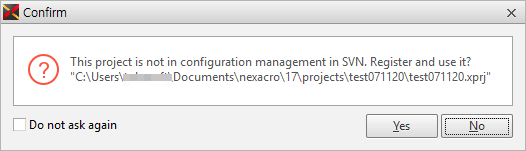 リポジトリに接続されていないプロジェクトを実行した状態で、SVNを使用するオプションを変更した場合には、下記のようなリポジトリの登録有無を確認するポップアップメッセージが表示されます。「Yes」をクリックした場合は、Import機能を実行します。