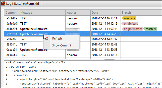 衝突が発生したファイルは、nexacro StudioのXMLエディタで開きます。「HEAD」の下にあるコードがPullコマンド実行前にLocal RepositoryにCommitされたコードです。「=======」の下にあるコードは、Remote Repositoryから取得したコードです。変更されたコードを確認して変更すると、衝突を解決することができます。