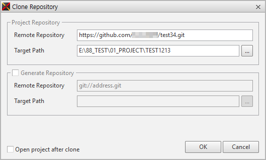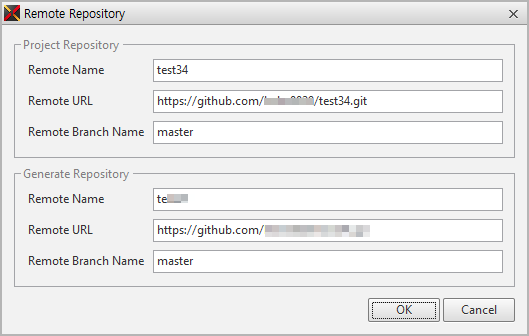 Project Repositoryのみ設定した場合には、Project Repositoryのみ表示され、Generate Repositoryまで設定した場合には、Project Repository、Generate Repositoryの2つの項目が表示されます。プロジェクトのパスは、デフォルトで設定されたパスの下位プロジェクト名でフォルダを生成し、Repositoryを自動的に指定します。