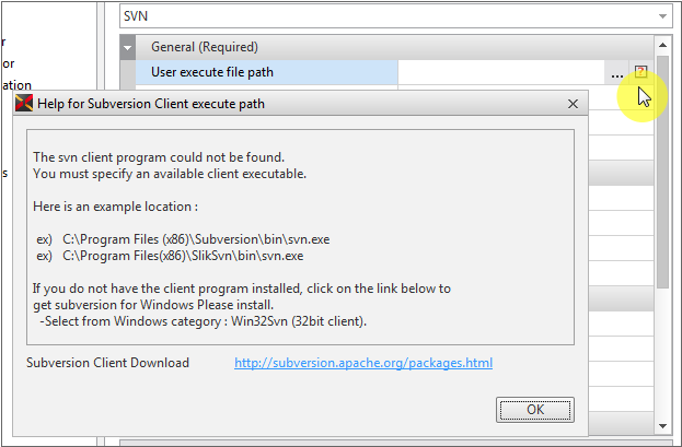 「User execute file path」項目の右側に[?]ボタンをクリックすると、SVNクライアントのインストールに必要な情報を確認することができます。