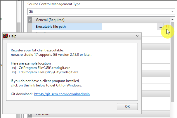「Executable file path」項目の右側に「?」ボタンをクリックすると、ギットクライアントのインストールに必要な情報を確認することができます。