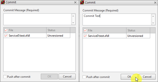 リストからチェックされたファイルリストのみリポジトリに登録されるようにスケジュールされ、その後に別々に、"Commit"を実行するとリポジトリに実際に反映されます。