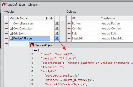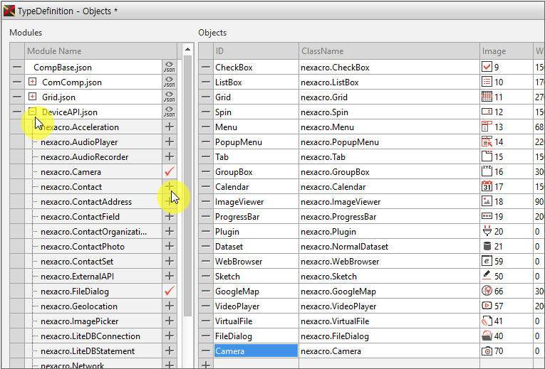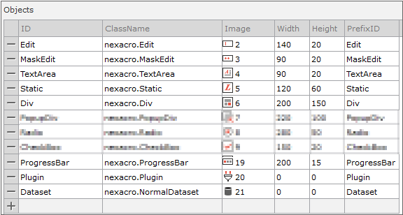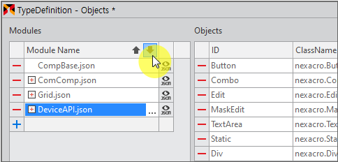 Objectsリストには、頻繁に使用するオブジェクトのみ登録されています。モジュール情報の中でComComp、Grid、DeviceAPI項目に含まれているオブジェクトは、リストを広げた後に追加するオブジェクトを選択して、[+]ボタンをクリックすると、Objectsリストに追加されます。