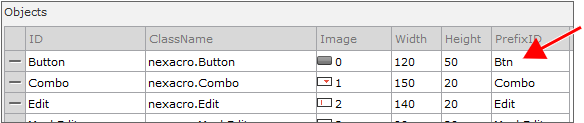 プロジェクト内のネーミングルールに基づいて、各コンポーネントやオブジェクトのPrefixIDを指定することができます。たとえば、ButtonコンポーネントのPrefixIDを「Btn」に変更すると、画面上に配置したButtonコンポーネントのidは「Btn00」で開始します。