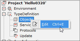 TypeDefinitionエディタは、Project Explorerのコンテキストメニューから[TypeDefinition]の下位メニューをダブルクリックするか、マウス右ボタンをクリックし、メニューから[Edit]項目を選択してポップアップウィンドウで開くことができます。