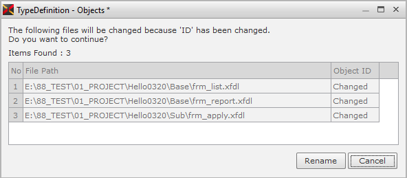 Objectsリストで[Button]項目のIDを[Button2]に変更した場合、すべてのプロジェクトの中で、[Button]を使用しているすべてのFormリストを出力します。[Rename]ボタンをクリックすると、ID値のすべて変更し、変更するFormを開いて、変更された内容を保存します。