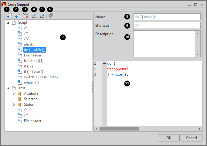 (XCSSまたはScriptの編集ウィンドウで、Shortcutに指定されたフレーズの入力時にコードスニペットを反映)