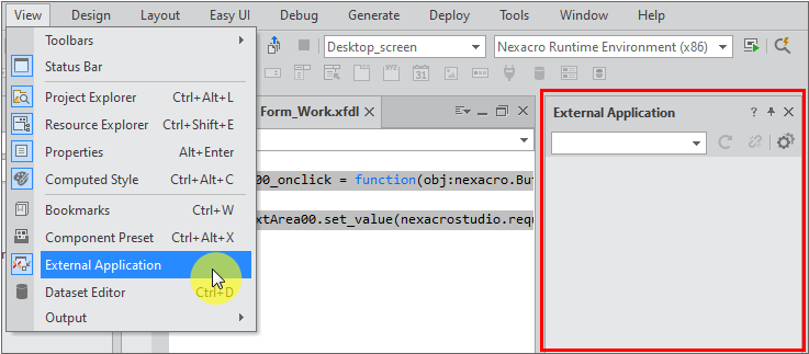 メニューの「View > External Application」を選択してExternal Applicationウィンドウを表示します。