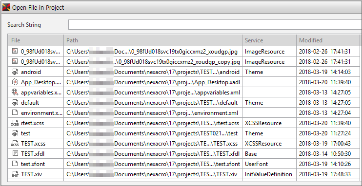 Search Stringに文字列入力時、プロジェクトファイル内のファイル名に該当文字列が含まれているリストをリアルタイムで更新します。ファイルリストから特定のファイルの項目をダブルクリックすると、該当ファイルの編集ビューが開かれます。