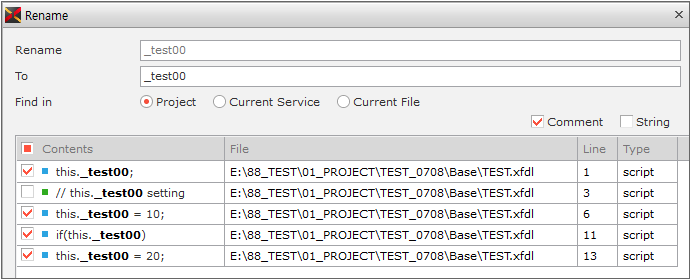 Rename範囲は、プロジェクト、サービス、ファイル中に選択して変更することができます。コメントの内容までの文字列を検索するには、「Comments」をチェックします。通常の文字列までナビゲートするには、「Strings」をチェックします。