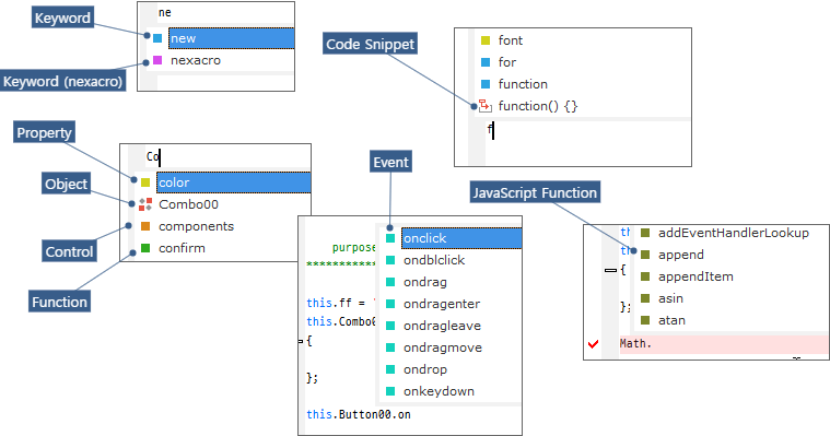 インテリセンスは、スクリプトやXCSS編集画面で文字列を入力するときに、使用できるコード(メンバー、関数、パラメータ、コードスニペット)リストを提供して、ユーザーが簡単かつ迅速にファイルを編集することができるように補助する機能です。インテリセンス機能を使用して文字列を入力して直接実行するには、Ctrl+Spaceキーを入力します。