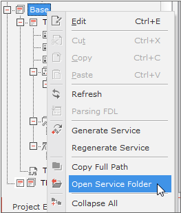Project Explorerが有効の状態で、現在選択した項目がService、Directory(File type serviceのsub directory)の場合、該当パスを開きます。 Project ExplorerのPopup Menuで実行します。