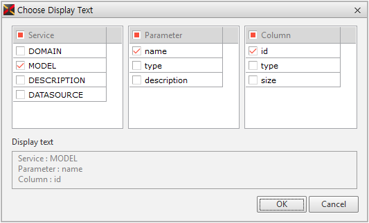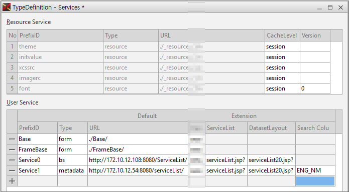 type項目は「metadata」を選択し、サービスパスとServiceList、DatasetLayout、Search Column項目を入力します。Service List項目は、ドメイン、モデルが定義されたXML形式の戻り値を持ちます。DatasetLayout項目は、Datasetが定義されたXML形式の戻り値を持ちます。