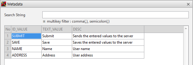 TypeDefinitionでSearch Column項目を指定すると、metadataを選択するウィンドウでテキストを検索時、検索対象カラムを指定することができます。値を指定しなかった場合にはすべてのカラムを対象に検索を処理します。