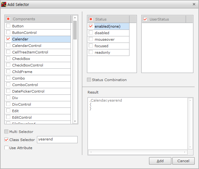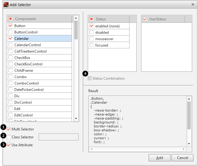 1 | Multi Selector | 同じ値を持つ複数のセレクタを纏めて指定します。 2つ以上のコンポーネントを選択するか、Statusを2つ以上選択した場合、チェックボックスの領域が活性化され、チェックすると、Multi Selectorに処理します。 例えば、Button、Calendarコンポーネントを選択して、Multi Selectorをチェックすると、下記のように処理します。 .Calendar { } |