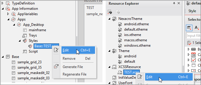 XCSSエディタは、Project ExplorerでXCSSファイルを選択するか、Resource ExplorerでXCSSファイルを選択してダブルクリックするか、ファイルを選択してコンテキストメニューから[Edit]を選択して編集することができます。