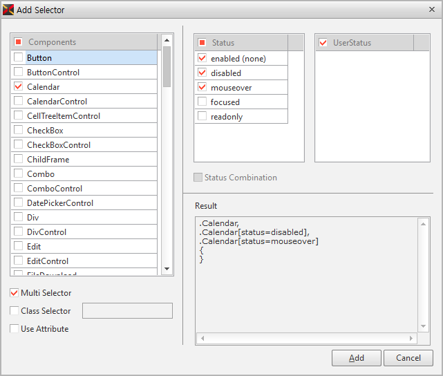 例えば、Buttonコンポーネントのmouseover Status項目とselected UserStatus項目を選択した後、該当項目をチェックすると、下記のように処理します。.Button[status=mouseover][userstatus=selected]