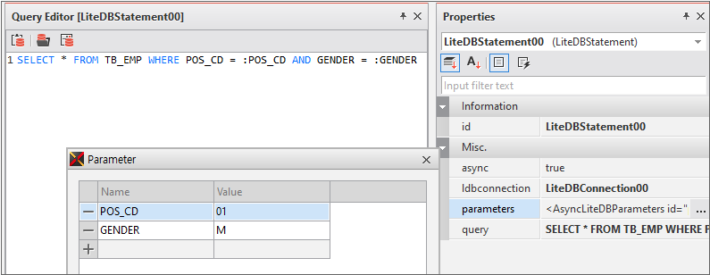 クエリを作成するときにパラメータ値を別々に設定することができます。parametersプロパティ値を下図のように設定して、クエリステートメントで「:POS_CD」のような形式で作成すると、クエリの実行時にparametersプロパティに定義された値をパラメータ値として使用します。