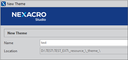 「Location」項目にはプロジェクトのパスを基準とした値が自動設定され、編集できません。「Name」項目に、生成されるパスに既に存在するTheme名と同じ名前は指定できません。
