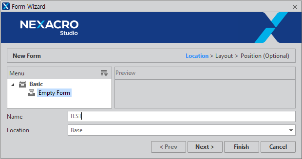 Locationを選択して[Finish]ボタンをクリックすると、選択されたFormテンプレートで新しいFormが生成されます。