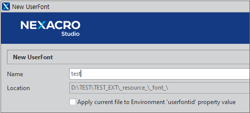 「Apply current file to Environment 'userfontid' property value」の項目をチェックすると、生成されたUserFontをEnvironmentのuserfontidプロパティ値として指定します。userfontidプロパティ値は、UserFontファイルの作成後に変更または削除することができます。