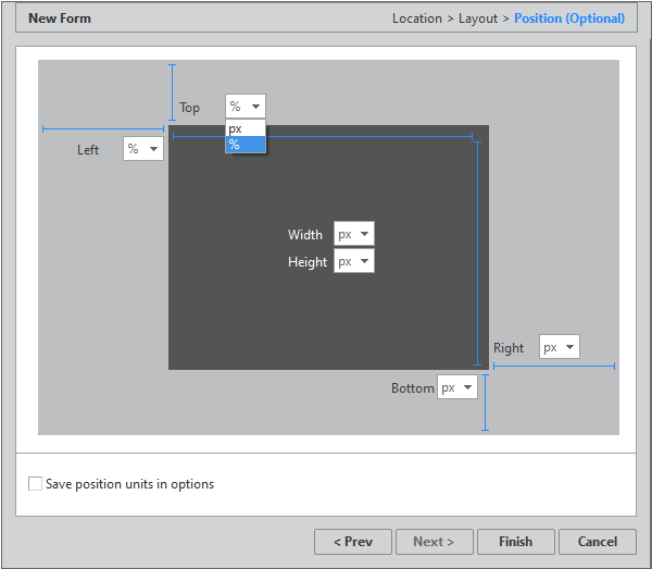 formでコンポーネント生成時に適用されるPositionプロパティ値の単位を設定します。デフォルト値はOptionで指定した値で表示されます。