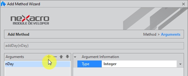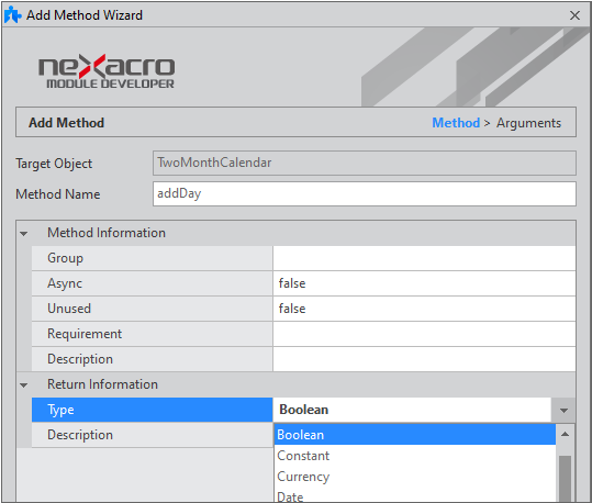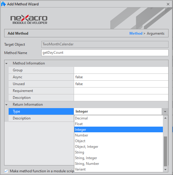 Method Informationでは、メソッド関連情報を設定できます。例題では、2つのCalendarコンポーネントから選択した日付の間の差を計算して返すメソッドを作成します。Return Information項目でTypeの値を「Integer」に設定します。
