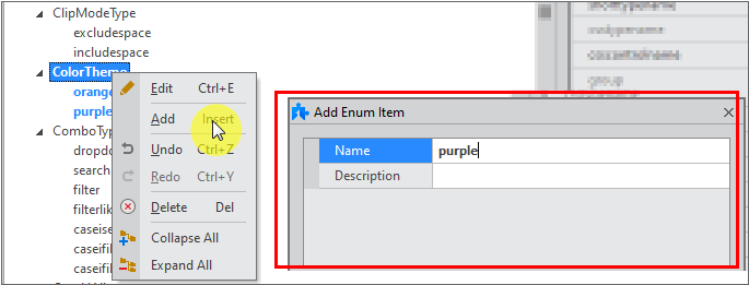 追加したEnum項目を選択し、コンテキストメニューから「Add」項目を選択した後、「Add Enum Item」ウィンドウで「orange」、「purple」を追加します。