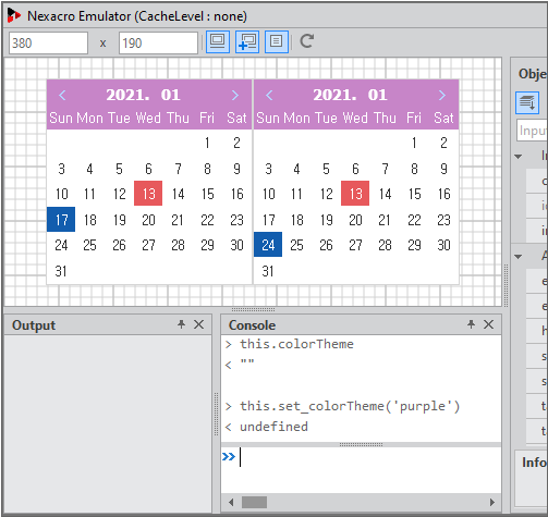 エミュレータを実行し、最初のCalendarコンポーネントで日付を選択し、コンソールウィンドウでプロパティ値を確認します。