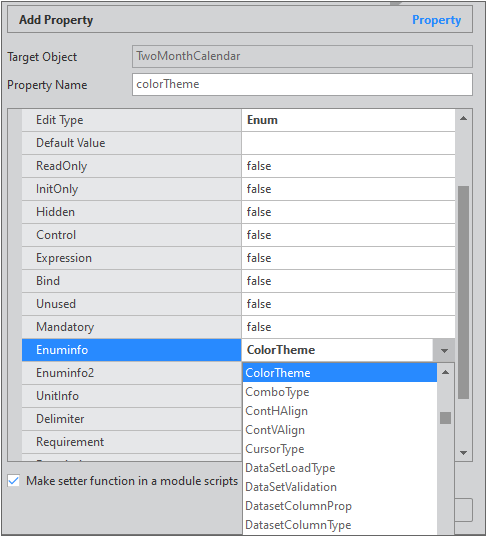 Calendarコンポーネントのスタイルを変更できるプロパティを追加します。 プロパティ名はcolorThemeです。プロパティを追加する前にEnumInfoから追加する必要があります。