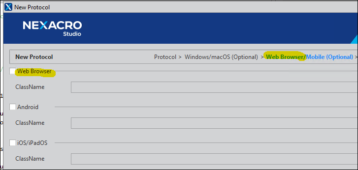 1. nexacro studioのNew Protocol Wizard画面にて、「HTML5」で表示されていた項目名を「Web Browser」に変更しました。(RP 92601)