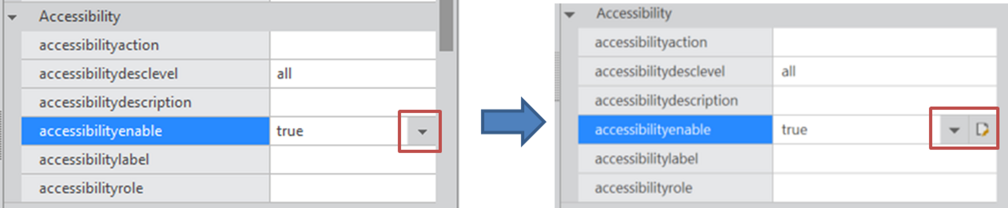 GridコンポーネントのGridCellControl、CellSubCellControlオブジェクトの accessibilityenableプロパティにexpr機能を追加しました。(RP 95871)