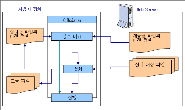 MiUpdater의 역할은 MiPlatform에서 사용해야 되는 모듈을 MiPlatform을 사용하기 전에 사용자 장치에 설치 되어 있도록 하는 것 입니다. 다만, MiPlatform을 사용할 때마다 MiPlatform을 다시 설치하는 것은 비효율 적이므로 MiUpdater에는 MiPlatform의 버전을 관리 하기 위한 기능이 포함되어 있습니다.