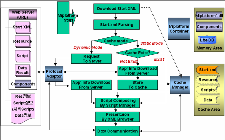 MiPlatform이 실행되면 Caching의 방법 중 Session을 이용하여 StartXML을 다운로드한 후 StartXML을 분석합니다. Application Group별 CacheLevel에 따라서 화면 및 서비스 로직 XML의 버전을 관리합니다.