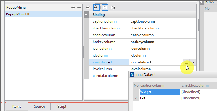 Select the PopupMenu00 item to set innerdataset in the property window to the right.