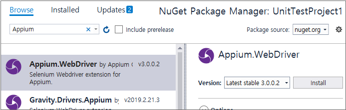 Select the menu [Project > Manage NuGet Package] and then enter "Appium" in the search window to check the Appium WebDriver library in the search results. Click the [Install] button to install the library.