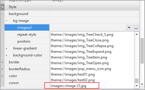 This segment manages image files that can be globally used within a project. The added image files will be exposed in the Properties pane when you need to specify an image file as the value of a certain property in the process of developing a Form.