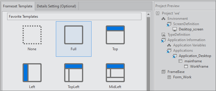 새로운 프로젝트를 생성합니다. Frameset Template에서 Full 타입을 선택합니다.
