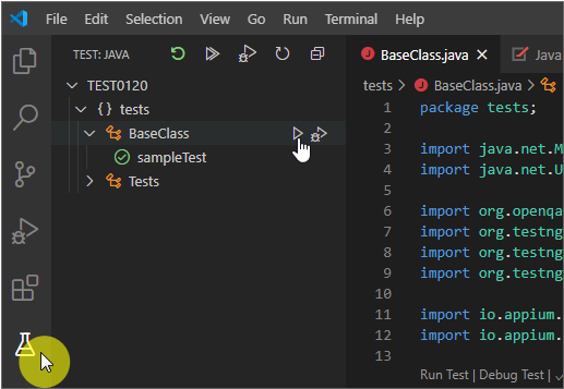 사이드바에서 Test를 선택하고 BaseClass 항목에 있는 [Run] 버튼을 클릭합니다.