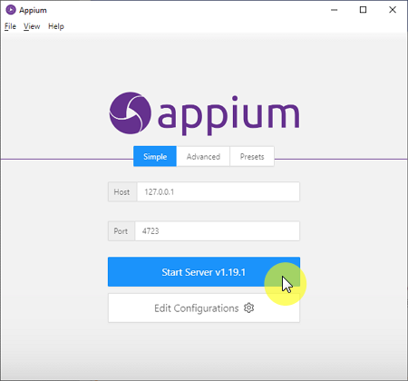 [Start Server] 버튼을 클릭해 Appium 서버를 시작합니다.